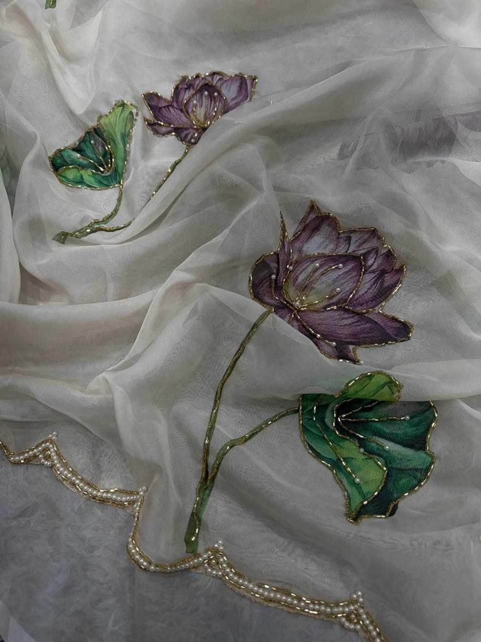NC 5386 Soft Organza White Beautiful floral print Saree